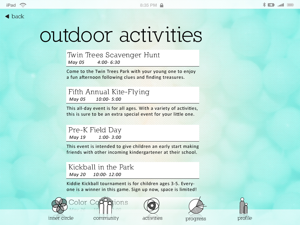 This page is an example of a local activity page. The user has a opportunity to read about the event, see which areas of growth are developed through this event, as well as the date, time and location. All of the time and location information can be saved to the iCal and Map applications, respectively. Many parents have busy schedules and it can be easy to overlook/forget events. This app tries to prevent that from happening by tagging events both within it's own calendar (which appears on the front/beginning page) as well as exports it to iCal. Yay for reminders!
